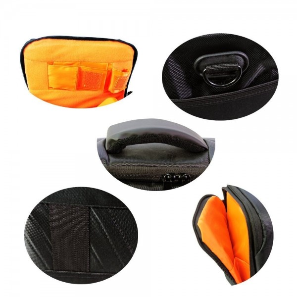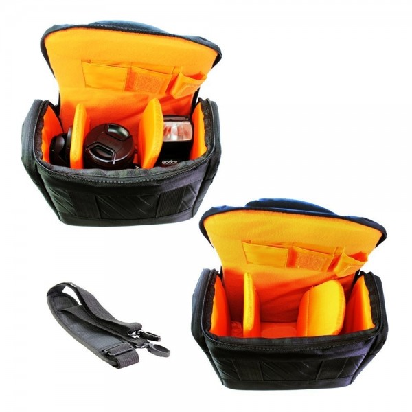 Bolsa prática para o transporte de máquinas fotográficas flash e acessórios. Possui três bolsos com zíper.. O compartimento principal possui divisórias internas fixadas com velcro que podem ser reposicionadas ou até mesmo retiradas.