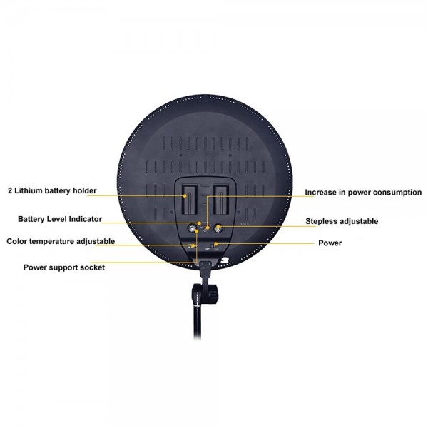 O painel de LED circular RPAD 18D fornece iluminação contínua com 400 lâmpadas de LED. A potência da luz pode ser regulada de acordo com a necessidade, assim como a temperatura de cor, que varia de 3200K (luz amarela) a 5600K (luz branca).
