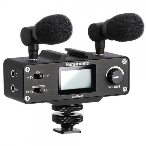 Com uma estrutura simples e prática, este Sistema CA-Mixer da Saramonic possui compatibilidade com qualquer tipo de câmera DSRL que possua entrada para cabo de áudio P2 (3,5mm) e sapata hotshoe, fornecendo muito mais praticidade para o usuário durante a gravação. Além disso, o CA-Mixer ainda fornece um controle de volume, menu para monitoramento Play/Rec, uma conexão para tripés com pino padrão ¼ e uma conexão hotshoe para fixação de outro microfone na parte central do sistema, aumentando assim ainda mais a captação dos sons.