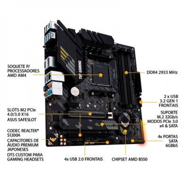 Placa-mãe Asus TUF Gaming B550M-Plus AMD DDR4 A TUF Gaming B550M-PLUS reúne os elementos essenciais da mais recente plataforma AMD e os combina com funcionalidades prontas para jogos e durabilidade comprovada. Projetadas com componentes de nível militar, soluções de energia aprimoradas e um conjunto abrangente de opções de refrigeração, essas placas-mãe oferecem desempenho sólido com estabilidade inabalável em jogos. Soquete AMD AM4 Pronto para processadores AMD Ryzen™ de 3ª geração. Solução de energia aprimorada 8+2 fases de alimentação, conector ProCool, componentes TUF de nível militar e VRM Digi+ para máxima durabilidade. Refrigeração abrangente Dissipadores de calor no VRM, dissipador de calor sem ventoinha no PCH, dissipador de calor M.2, header de ventoinha híbridos e utilitário Fan Xpert 2+. Conectividade de última geração Suporte para PCIe 4.0 M.2, USB 3.2 Gen 2 Tipo-A e Tipo-C Feita para jogos on-line Tecnologia de Rede de 2,5 Gb, TUF LANGuard e TurboLAN Codec Realtek S1200A Qualidade de áudio cristalina sem precedentes, com taxa de sinal-ruído de 108 dB para saída estéreo e SNR de 103 dB para entrada. Microfone com cancelamento de ruído por AI Fornece comunicação de voz cristalina no jogo Garanta já a sua placa-mãe Asus TUF Gaming B550M-Plus AMD DDR4